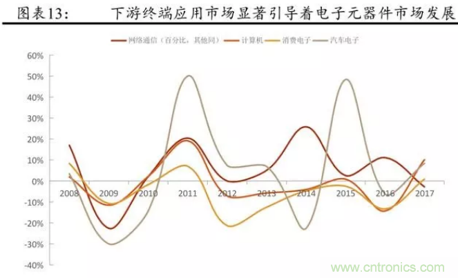從被動(dòng)元件的發(fā)展歷程來(lái)看,近些年來(lái),產(chǎn)業(yè)鏈下游的需求擴(kuò)大主導(dǎo)著被動(dòng)元件市場(chǎng)的擴(kuò)張。金融危機(jī)以來(lái),全球電子元件市場(chǎng)規(guī)模的增長(zhǎng)主要來(lái)自于網(wǎng)絡(luò)通信與汽車電子,尤其是智能手機(jī)。