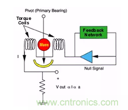 伺服加速度計(jì)如下所示,懸掛在鉸鏈上的是一個(gè)下垂的高磁導(dǎo)率質(zhì)量。“向下”或“零位置”由零檢測器檢測,平衡力由磁線圈提供。
