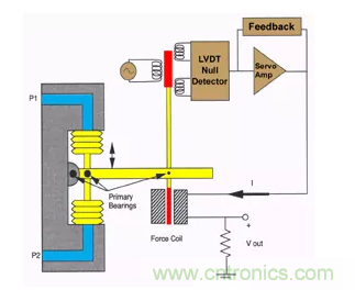 如果對這個(gè)組件施加加速度,就會對質(zhì)量施加一個(gè)力,它將試圖從零位置移動(dòng)。當(dāng)零檢測器檢測到運(yùn)動(dòng)時(shí),通過伺服放大器增加線圈電流以保持零位置。