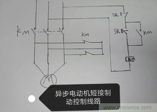 這種電路一般出現(xiàn)制動(dòng)問題,大多都是由于頻繁啟停導(dǎo)致剎車系統(tǒng)問題,而所謂的剎車系統(tǒng)就一交流接觸器,結(jié)合電路圖不難看出,當(dāng)交流接觸器常閉觸點(diǎn)出現(xiàn)問題,剎車系統(tǒng)就出問題了。diangon.com在電源斷開時(shí),電機(jī)在慣性作用下轉(zhuǎn)子不會(huì)立刻停下來,而且轉(zhuǎn)子存在剩磁,斷電時(shí)KM兩副常閉觸點(diǎn)將電動(dòng)機(jī)定子繞組短接,而轉(zhuǎn)子的慣性旋轉(zhuǎn)磁場(chǎng)切割定子閉合的繞組后,電機(jī)內(nèi)部就形成一種反向制動(dòng)力,從而達(dá)到制動(dòng)目的。