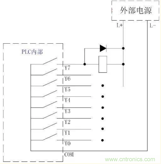和繼電器輸出形式電路一樣,在驅(qū)動感性負(fù)載時也要在負(fù)載兩端反向并聯(lián)二極管(二極管的陰極接電源的正極)防止過電壓,保護(hù)PLC的輸出電路。