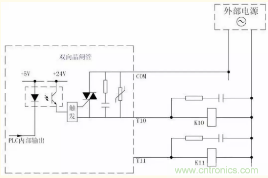 這是PLC輸出電路常見的一種形式,其電路形式如下圖所示。該種輸出電路形式外接電源既可以是直流,也可以是交流。