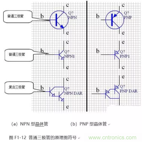這兩種類型的晶體管外形完全相同,都包括3個引腳,即b(基極)、c(集電極)和e(發(fā)射極),但是其原理圖符號卻不一樣,如圖F1-12所示。三極管的原理圖符號的常用名稱有“NPN”、“NPN1” 和“PNP”、“PNP1”等。