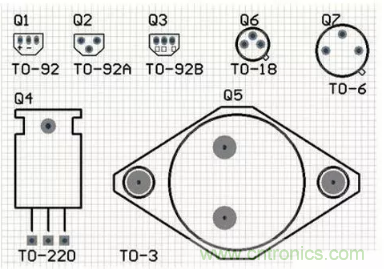 普通三極管的原理圖符號為NPN或PNP,常見的三極管封裝為“TO-92B”,而大功率三極管可用“TO-220”、“TO-3”等元器件封裝。