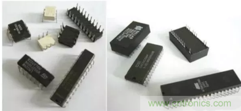 圖F1-20 雙列直插式集成電路芯片 在電路板調試過程中,常常在電路板上焊接IC座,然后將集成電路芯片插在IC座上,這樣可以方便集成電路芯片的拆卸。圖F1-21所示為常用的IC座,其對應的元器件封裝如圖F1-22所示。
