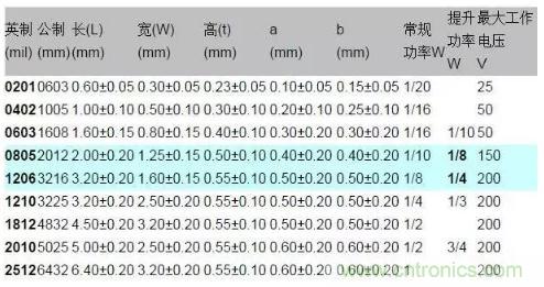2)貼片電阻的封裝、功率與電壓關系如下表: