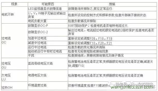 雖然每家的故障代碼可能會有差異,但是一般離不開過流(OC),過載(OL),過壓(OU),欠壓(LU),過熱(OH)等著幾類,理論這些可以根據(jù)手冊的要求來操作,流程都是傻瓜式的。實(shí)際一般用戶能處理的,就是確保輸入電壓正常,電機(jī)連接線正常,電機(jī)絕緣沒有問題,電機(jī)三相平衡等,然后調(diào)整一下加減速時(shí)間等簡單處理,下邊說一些手冊上沒有的故障,這些故障你見過嗎,知道如何處理嗎,一起來看看。