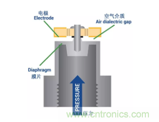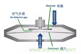簡單地說,這些壓力傳感器是一種電容器,一種具有充電能力的裝置。當壓力作用到傳感器內(nèi)部的膜片上時,膜片就會收縮,或向固定電極彎曲,并改變電容。這種物理變化會導致電子輸出的變化,該裝置可將壓力讀數(shù)轉(zhuǎn)換成電流或電壓值。