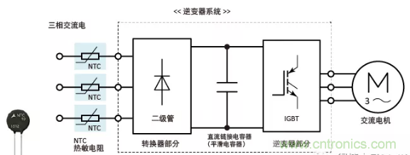 逆變器系統(tǒng)主要由轉換器級、逆變器級和直流側電容(平滑電容)組成,該電容放置在轉換器級之后,如下所示。上電時,器件會通過沖擊電流進行充電,而該沖擊電流的峰值是(為直流側電容充電的)穩(wěn)定電流的若干倍。該沖擊電流可能會對直流電容的使用壽命產(chǎn)生不利影響,或損壞半導體器件。為了防止沖擊電流,我們需要連接NTC熱敏電阻。