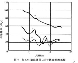 EMI濾波器能有效抑制單片開關(guān)電源的電磁干擾。圖4中曲線a為不加EMI濾波器時開關(guān)電源上0.15MHz~30MHz傳導噪聲的波形(即電磁干擾峰值包絡(luò)線)。曲線b是插入如圖3(d)所示EMI濾波器后的波形,能將電磁干擾衰減50dBμV~70dBμV。顯然,這種EMI濾波器的效果更佳。