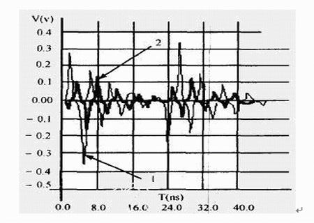 干擾源信號(hào)頻率越高,被干擾對(duì)象上的串?dāng)_幅值越大,我們對(duì)圖1中干擾源網(wǎng)絡(luò)AB上的信號(hào)頻率f1分別取不同頻率值時(shí),對(duì)被干擾對(duì)象上的串?dāng)_進(jìn)行了仿真,仿真結(jié)果見(jiàn)表2,信號(hào)頻率不同時(shí)的串?dāng)_波形見(jiàn)圖5,標(biāo)記為“1”、“2”箭頭所指的波形頻率分別為“500MHz”、“100MHz”。