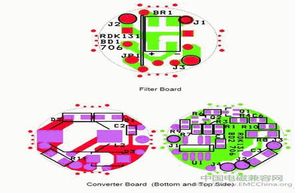 雖然該設(shè)計具有功能性,但仍存在傳導(dǎo)輻射問題。由于兩個PCB比較接近,開關(guān)電流會從轉(zhuǎn)換器電路板耦合到EMI濾波器電路板,從而降低EMI濾波器的性能。通過在這兩個電路板之間放置“屏蔽”PCB,這一問題便得以解決。而第三個電路板只是一層銅,并無電路。它被電氣連接到EMI濾波器負(fù)輸出端與轉(zhuǎn)換器負(fù)輸入端的接合處。這樣,總裝便由三個疊加在一起的圓形電路板組成。增加第三個電路板既簡單又節(jié)省成本,不但解決了耦合問題,還達(dá)到了EMI性能要求。