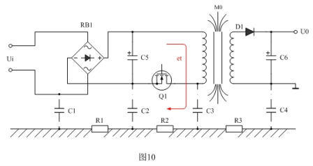 值得一提的是,開關(guān)電源變壓器初級(jí)線圈的漏感產(chǎn)生的反電動(dòng)勢(shì)et,在所有干擾信號(hào)之中是最不容忽視的,如圖10所示。當(dāng)電源開關(guān)管關(guān)斷的時(shí)候,開關(guān)電源變壓器初級(jí)線圈的漏感產(chǎn)生的反電動(dòng)勢(shì)et幾乎沒有回路可釋放,一方面,它只能通過初級(jí)線圈的分布電容進(jìn)行充電,并讓初級(jí)線圈的分布電容與漏感產(chǎn)生并聯(lián)諧振;另一方面,它只能通過輻射向外進(jìn)行釋放,其中通過對(duì)地電容C3與大地相連,也是反電動(dòng)勢(shì)et釋放能量的一個(gè)回路,因此,它對(duì)輸入端也會(huì)產(chǎn)生共模信號(hào)干擾。