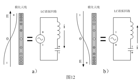 圖12是極化天線的工作原理圖,圖12-a)和圖12-b)表示天線在電場(chǎng)中被感應(yīng)產(chǎn)生極化的兩種不同情形。所謂極化就是導(dǎo)體或物體在電場(chǎng)力的作用下產(chǎn)生帶電,這種帶電是極化帶電,即:導(dǎo)體或物體的一端帶正電,而另一端帶負(fù)電。一般地說,導(dǎo)體或物體被極化帶電,只是兩端帶電,而中心點(diǎn)是不帶電的。由于,極化天線的電場(chǎng)是一個(gè)交變電場(chǎng),所以,天線總是在圖12-a)和圖12-b)之間來回變化。12-a)和圖12-b)最左邊的圖形是表示電場(chǎng)方向和天線的電荷分布曲線,中間圖形表示載流子在極化天線中流動(dòng),右邊圖形表示天線的等效電路。