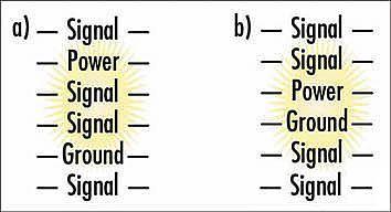 如果同一電壓源的兩個電源層需要輸出大電流,則電路板應(yīng)布成兩組電源層和接地層。在這種情況下,每對電源層和接地層之間都放置了絕緣層。這樣就得到我們期望的等分電流的兩對阻抗相等的電源匯流排。如果電源層的堆疊造成阻抗不相等,則分流就不均勻,瞬態(tài)電壓將大得多,并且EMI會急劇增加。