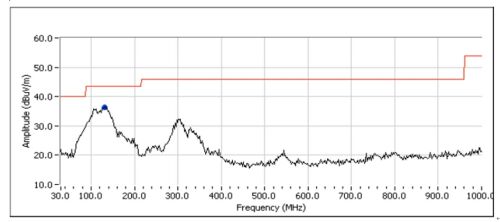 圖2.LM48310的EMI測(cè)試結(jié)果符合FCCB級(jí)限制水平。