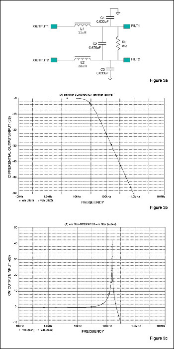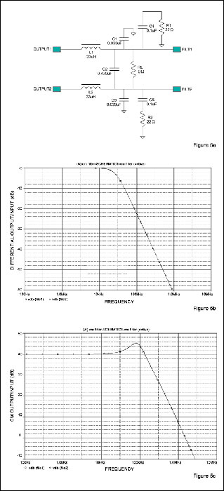 圖5.在傳統(tǒng)LC濾波器的每個(gè)輸出端增加一個(gè)RC網(wǎng)絡(luò)(a),可以改進(jìn)差分信號的頻響(b)和共模信號的頻響(c)。
