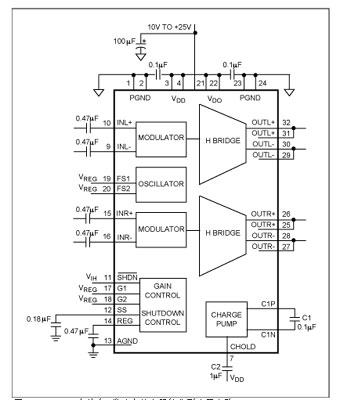 有些低開關(guān)頻率(200kHz至300kHz)應(yīng)用不適合采用圖5c所示的方案。對于這類產(chǎn)品可能需要采用其他方法和拓?fù)浣Y(jié)構(gòu)。MAX9704立體音D類放大器(圖6)可設(shè)置為940kHz固定頻率模式(FFM)(FS1=低,F(xiàn)S2=高),此時(shí)效果最佳。工作在FFM模式下的MAX9704通過引腳選擇將開關(guān)周期設(shè)為恒定值(具有三個(gè)可選項(xiàng)),以滿足應(yīng)用需求。