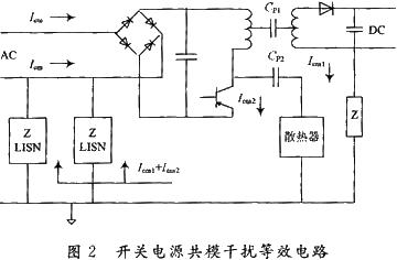 如圖2所示,當(dāng)開關(guān)管轉(zhuǎn)為“關(guān)”時(shí),集電極與發(fā)射極間的電壓快速上升達(dá)500V,他產(chǎn)生的電流經(jīng)集電極與地之間的分布電容返回整流橋,這個(gè)按開關(guān)頻率工作的脈沖串電流是共模噪聲。這個(gè)電壓會(huì)引起共模電流Icm2向CP2充電和共模電流Icm1向CP1充電,其中CP1為變壓器初、次級(jí)之間的分布電容,CP2為開關(guān)電源與散熱器之間的分布電容(即開關(guān)管集電極與地之間的分布電容)。則線路中共模電流總大小為Icm1+Icm2。