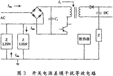 如圖3所示,當(dāng)開關(guān)管轉(zhuǎn)為“開”時(shí),儲(chǔ)能電容Cs的能量由AC電網(wǎng)和整流橋提供,他被開關(guān)管變換器的快速開關(guān)頻率所變換,并通過(guò)變壓器形成脈沖電流IL,他具有非常豐富的開關(guān)頻率諧波。儲(chǔ)能電容不是一個(gè)純電容,他有串聯(lián)電阻和電感。當(dāng)整流橋處開關(guān)管“開”時(shí),在AC電網(wǎng)端,IL會(huì)產(chǎn)生一個(gè)由電容的L,R,C所呈現(xiàn)的阻抗電壓,這就是開關(guān)電源產(chǎn)生差模發(fā)射源的原理。差模電流Idm和信號(hào)電流IL沿著導(dǎo)線、變壓器初級(jí)、開關(guān)管組成的回路流通。