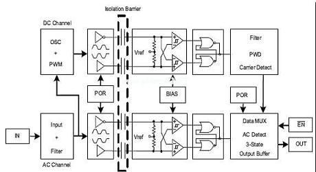 為了提供恒定信息的傳輸,ISO72x使用一個高信號速率和低信號速率通道來進(jìn)行通信,如圖9所示。高信號速率通道未被編碼,并且其在一個單端到差分轉(zhuǎn)換之后的隔離層上傳輸數(shù)據(jù)。該低信號速率通道以一種脈寬調(diào)制格式對數(shù)據(jù)進(jìn)行編碼,并在隔離層上差分傳輸數(shù)據(jù),從而確保了恒定狀態(tài)的精確通信(1和0的長字符)。
