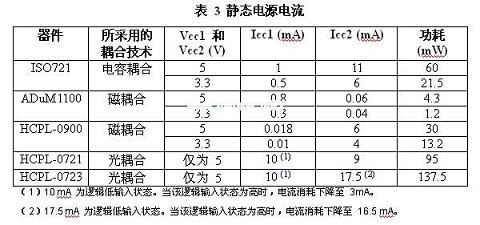 除了隔離層上信號傳輸?shù)男手?,輸入和輸出調(diào)節(jié)電路的設(shè)計同功耗的相關(guān)性最大。如表3所示,與電感或電容實例相比,光耦合器的功耗會更高。