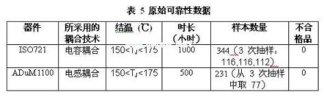 ADuM1100可靠性數(shù)據(jù)表沒有明確地說明MTTF,但是其提供了可靠性測試的結(jié)果。表5顯示了ISO721和ADuM1100可靠性測試的參數(shù)。