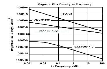 圖12對比了ADuM1100和ISO72x(沒有找到HCPL-0900的數(shù)據(jù))的磁場抗擾度。相對來說盡管這兩個實例均對磁場有一定的抗擾度,但是ISO72x提供了更大的裕度。如前面所述,光耦合隔離層電路對外部磁場具有內(nèi)在的磁化抗擾度。