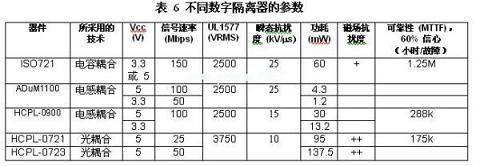 噪聲降低和噪聲保護(hù)使得隔離器在那些隔離器中斷接地環(huán)路并將接地電壓差隔離的電子電路中得到廣泛使用。設(shè)計人員現(xiàn)在擁有許多用來進(jìn)行數(shù)字信號隔離的選擇,包括TI推出的ISO72x系列,其在信號速率、電介質(zhì)擊穿電壓、瞬態(tài)抗擾度、功耗、磁場抗擾度以及可靠性等重要特性方面均表現(xiàn)不俗。表6對本報告中所討論實例的這些特性進(jìn)行了總結(jié)。