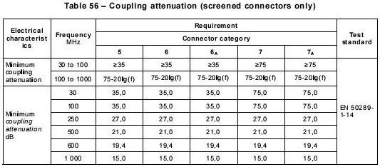 按IEC61196-1測(cè)試同軸電纜的方法,測(cè)試帶屏蔽的平衡電纜,短路8根芯線后用50Ω信號(hào)源激勵(lì)。被測(cè)試線長1米,測(cè)試頻率30MHz,頻率越高,線長越短導(dǎo)體表面轉(zhuǎn)移阻抗。主要用于評(píng)估連接硬件的屏蔽效率,其實(shí)測(cè)值不超過以下計(jì)算值。