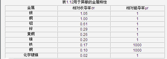 表1.12給出了一些常用屏蔽材料的相對導(dǎo)電率和導(dǎo)磁率。