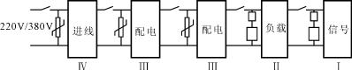 依據(jù)線路絕緣結(jié)構(gòu)理論及IEC61312、IEC664-1、IEC61643、GB50097-1994(2000年版)等標(biāo)準(zhǔn),對(duì)建筑物和電氣設(shè)備(如第三類防雷建筑物)進(jìn)行感應(yīng)過電壓防護(hù)的絕緣結(jié)構(gòu),如圖1所示。