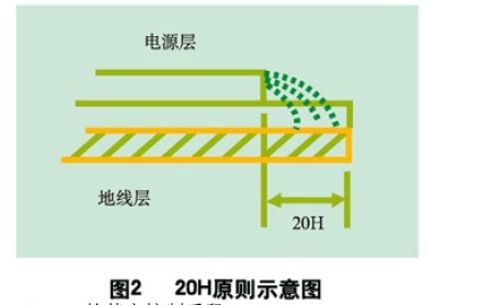 為了減小電源的邊緣輻射,電源/地平面應(yīng)遵循20H設(shè)計(jì)原則,即地平面尺寸比電源平面尺寸大20H(見(jiàn)圖2),這樣邊緣場(chǎng)輻射強(qiáng)度可下降70% 。