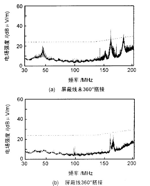 減小空間輻射測(cè)試曲線如圖4 所示。圖4(a)是一臺(tái)外接屏蔽電纜的設(shè)備的測(cè)試曲線,電纜與接口連接器相連的地方都是將屏蔽層擰成一條小辮(又稱(chēng)Pigtail),然后固定到連接器的螺釘上。屏蔽電纜能控制共模輻射是因?yàn)楣材k娏魈峁┝艘粋€(gè)低阻抗通路,使共模電流通過(guò)屏蔽層流回共模電壓源。電纜屏蔽層提供的共模電流通路的阻抗由電纜本身的阻抗及電纜與金屬機(jī)箱之間的搭接阻抗2 部分組成。因?yàn)殡娎|與金屬機(jī)箱之間的搭接阻抗(Pigtail的阻抗)較大,這就使得屏蔽層上形成了一個(gè)較大的共模電壓,在該電壓的驅(qū)動(dòng)下,電纜屏蔽層上會(huì)產(chǎn)生共模電流,因而屏蔽層變成了天線向外輻射。將Pigtail連接改成360 壓接在連接器的金屬外殼上,保證低阻抗搭接,測(cè)試結(jié)果如圖4(b)所示。