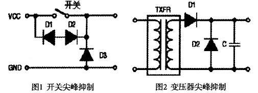 圖1中的二極管用于抑制高壓開(kāi)關(guān)的尖峰電壓。圖2是典型的變壓和整流電路,D2是肖特基或齊納二極管,用于抑制濾波后的尖峰瞬態(tài)噪聲電壓。