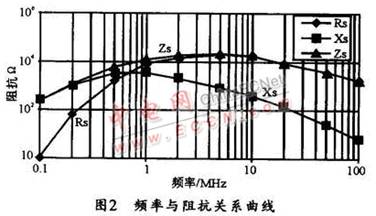 EMI 濾波器需要抑制的頻率范圍通常在10kHz~50 MHz之間。為了使共模濾波電路在此頻率范圍內(nèi)都能提供適當(dāng)?shù)乃p,磁芯在此頻率范圍內(nèi)的阻抗必須都要很高。共模磁芯的總阻抗(Zs)由串聯(lián)感性阻抗 (Xs)和串聯(lián)阻性阻抗(Rs)兩部分組成。在低頻部分,磁芯阻抗主要以感性阻抗為主,隨著頻率的增加,阻性阻抗逐步增加,漸漸起主要作用,圖2所示是頻率與阻抗的關(guān)系曲線。圖中,兩種阻抗的結(jié)合,可使磁芯在此全頻范圍內(nèi)提供合適的總阻抗(Zs)。