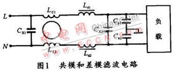 開關(guān)電源的開關(guān)頻率及其諧波的主要表現(xiàn)是電源線上的干擾,稱之為傳導(dǎo)干擾。傳導(dǎo)干擾分為共模干擾和差模干擾。共模干擾是由載流導(dǎo)體與大地之間的電位差產(chǎn)生的,其特點(diǎn)是兩條線上的干擾信號電壓是同電位同相的;而差模干擾則是由載流導(dǎo)體之間的電位差產(chǎn)生的,其特點(diǎn)是兩條線上的干擾信號電位相同,但相位相反。事實上,針對不同的干擾信號,EMI濾波電路也分為抗共模干擾濾波電路和抗差模干擾濾波電路,圖1所示是其濾波電路。