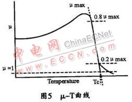 選擇電感的磁芯材料不但要考慮其磁特性,還要考慮其溫度特性,包括高低溫下的磁性變化和磁性材料的居里溫度特性。磁芯由鐵磁性(亞鐵磁性或反鐵磁性)轉(zhuǎn)變成順磁性的溫度稱為居里溫度。在圖5所示的 μ-T曲線上,80%μmax與20%μmax連線與μ=1的交叉點(diǎn)相對應(yīng)的溫度,即為居里溫度Tc。