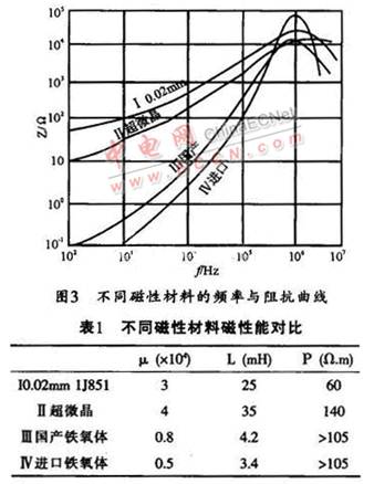 共模電感線圈如圖l中Lcl,Lc2是繞在一只磁芯上的兩組獨(dú)立的線圈,所繞圈數(shù)相同,繞向相反。這樣,當(dāng)EMI濾波器接入電路后,兩組線圈產(chǎn)生的磁通在磁芯中將相互抵消,故不會使磁芯飽和。對于干擾信號而言,共模磁芯一般工作在低磁場區(qū)域,所以,共模濾波電感選用的磁性材料要求具有較高的初始磁導(dǎo)率μi。如果只針對濾波器的插入損耗這一指標(biāo),則初始磁導(dǎo)率μi越高,濾波電路呈現(xiàn)的感抗就越大,所得到的插入損耗指標(biāo)就越好。但在整個電路中,還要綜合考慮磁性材料在電路中的其它特性,如頻率阻抗特性、居里溫度、磁材的形狀等等。μi值不同的各種磁性材料,在不同頻率下的阻抗特性也不一樣,故要根據(jù)所需要的頻率范圍來選取合適μi值的磁性材料。圖3所示是不同類型的高μi軟磁材料在同樣條件下的頻率與阻抗關(guān)系曲線,該曲線反映出電感磁芯的插入損耗變化趨勢。其它的性能參數(shù)(如電感值、體電阻等)如表1所列。