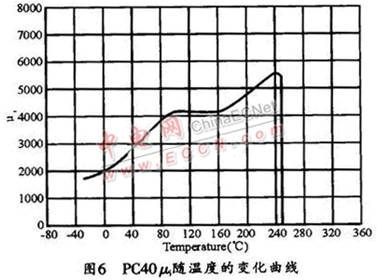 中小功率的EMI濾波器產(chǎn)品中選用最多的磁芯材料是日本TDK公司 的PC40 (它是目前業(yè)界廣泛使用的較好的材料之一),它的初始磁導(dǎo)μi隨溫度的變化曲線如圖6所示。從圖中可看出,溫度變化對μi的影響是很大的,磁芯溫度在 90~150℃的區(qū)間內(nèi),有一段平坦區(qū),這時它的μi大約在4100左右;當(dāng)溫度低于90℃后,μi值會隨著溫度的降低而逐漸減小,到0℃時,μi值只有 2000左右,進(jìn)到負(fù)溫區(qū)后,μi值還會進(jìn)一步減小;而當(dāng)溫度高于150℃后,μi值則會隨著溫度的升高而增加,當(dāng)達(dá)到240℃時,μ的最大值為5600 左右;從240℃開始,μi值又漸漸減小,當(dāng)溫度達(dá)到居里溫度點(diǎn)250℃時,材料失去磁性。