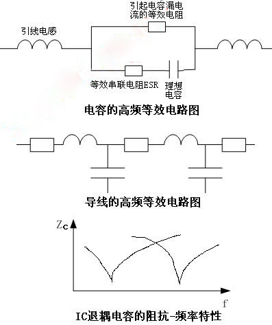 電容,在中低頻或直流情況下,就是一個儲能組件,只表現(xiàn)為一個電容的特性,但在高頻情況下,它就不僅僅是個電容了,它有一個理想電容的特性,有漏電流(在高頻等效電路上表現(xiàn)為R),有引線電感,還在導(dǎo)致電壓脈沖波動情況下發(fā)熱的ESR(等效串聯(lián)電阻),(如圖)。從這個圖上分析,能幫我們設(shè)計師得出很多有益的設(shè)計思路。第一,按照常規(guī)思路,1/2πfc是電容的容抗,應(yīng)該是頻率越高,容抗越小,濾波效果越好,即越高頻的雜波越容易被泄放掉,但事實并非如此,因為引線電感的存在,一支電容僅僅在其1/2πfc=2πf L等式成立的時候,才是整體阻抗最小的時候,濾波效果才最好,頻率高了低了都會濾波效果下降,由此就可以分析出結(jié)論,為什么在IC的VCC端都會加兩支電容,一支電解的,一支瓷片的,并且容值一般相差100倍以上多一點。就是兩支不同的電容的諧振頻率點岔開了一段距離,既利于對稍高頻的濾波,也利于對較低頻的濾波。