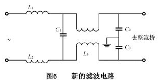 本電路主要的EMI問(wèn)題是電源噪聲傳入電網(wǎng),將原來(lái)的共模扼流圈L11與電容C11及C12組成的濾波電路變?yōu)槿鐖D6所示電路。L1,L2,C1可除去差模干擾,L3,C2,C3可除去共模干擾。L1,L2為不易磁飽和的材料;C1可選陶瓷電容;L3為共模扼流圈;選定C=C2=C3及截止頻率fo,則可根據(jù)L3=1/〔(2πfo)2C〕計(jì)算L3;選定C1及截止頻率fo,可根據(jù)L1=L2=1/〔2(2πfo)2C1〕計(jì)算L1及L2。