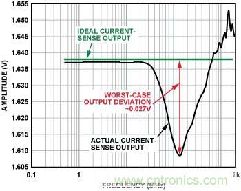 圖2. 電流傳感器輸出(無內(nèi)置EMI濾波器,前向功率 = 12 dBm, 100 mV/分頻,3 MHz時直流輸出達(dá)到峰值)