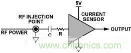 具體而言,這些測試都采用 “直接功率注入法”完成,這是一種通過電容將RF信號耦合至特定器件引腳的方法。根據(jù)待測IC的類型,針對不同的RF信號功率水平和頻率范圍,測試器件的每路輸入。圖4顯示了在特定引腳上執(zhí)行直接功率注入測試的原理示意圖。