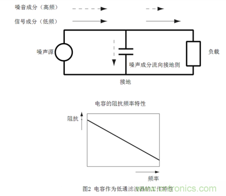 低通濾波器如果要利用該特性,就需要將電容插入噪聲通道與地線之間。如此一來,低頻信號(hào)能夠照常通過,高頻噪聲成分因接地側(cè)的阻抗較低,將流向接地側(cè),從而達(dá)到降噪效果。