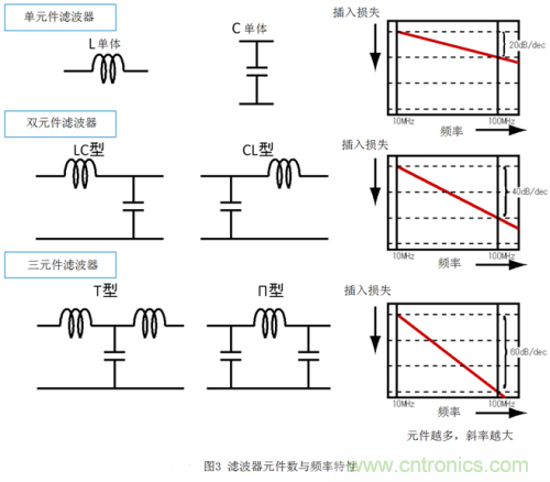 圖 3顯示了組成濾波器的元件數(shù)與濾波器頻率特性之間的關(guān)系。想知道什么是插入損耗,可以看一下圖中各濾波器的信號(hào)衰減量,圖越往下衰減量越多。從圖上我們可 以看到,濾波器中的元件越多,頻率特性的斜率就越大。元件較少的濾波器的頻率特性范圍較窄(斜率較小),衰減頻率及通過頻率的選擇度較低,有可能導(dǎo)致部分 信號(hào)衰減或者噪聲沒有徹底去除。另一方面,元件較多的濾波器的頻率特性范圍較寬(斜率較大),頻率的選擇度較高,信號(hào)可以在幾乎不衰減的狀態(tài)下去除噪聲。