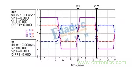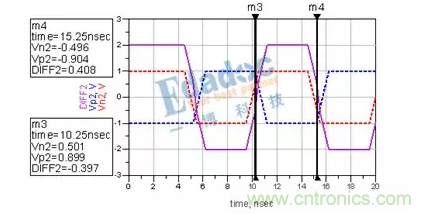 可以看到,兩次經過零軸的時間由之前的5ns變成了4.8ns?;蛘哒f,N與P的長度差,引起了0.04UI的抖動。這時候,串行的Clock recovery該花點心思才能將其時鐘解出來了。而且在進行時鐘與數(shù)據(jù)對位的時候,是對在0V這個階梯的左邊還是對在右邊呢?這又會引起時序問題的出現(xiàn)。