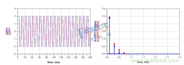 圖中,藍色的是N與P不等長的信號,可以看到,當兩線不等長的時候,差分信號的能量明顯變弱了,那多的能量去哪里了呢?