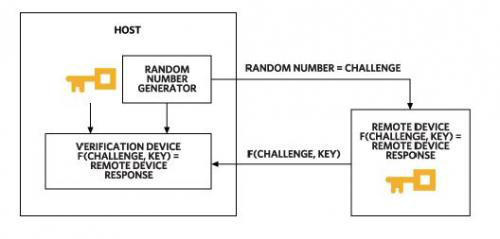 對稱加密安全認證依賴于共享密鑰。主機和被認證設(shè)備持有相同的密鑰。主機向設(shè)備發(fā)送一個隨機數(shù),即質(zhì)詢。設(shè)備計算一個數(shù)字簽名,該簽名是密鑰和質(zhì)詢的函數(shù),并發(fā)送回主機。主機執(zhí)行相同的運算并對結(jié)果進行比較。如果兩項計算結(jié)果一致,則設(shè)備通過安全認證(圖1)。為了確保結(jié)果不被模仿,必須使用數(shù)學(xué)屬性足夠的函數(shù);例如必須保證不可能通過計算結(jié)果獲得密鑰。SHA-256等安全散列函數(shù)滿足這些要求。對于質(zhì)詢-應(yīng)答方法,設(shè)備在不泄露密鑰的情況下證明自己知道密鑰。即使攻擊者攔截通信,也無法接觸到密鑰。