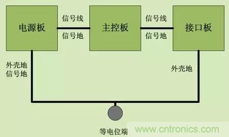 靜電要得到有效釋放,就要保證良好的接地。對(duì)于醫(yī)療電子,一般的醫(yī)療電子產(chǎn)品比如監(jiān)護(hù)儀,機(jī)身后面都會(huì)有一個(gè)等電位接地端。在做ESD試驗(yàn)的時(shí)候,這個(gè)接地 端也是要接大地的,這樣就有了一個(gè)靜電快速泄放的途徑。如圖5.1,假如主電路板分為三個(gè)模塊:電源板,主控板和接口板,接口板的接口外殼地要和信號(hào)地分 開,然后接口板的外殼地和等電位端用粗導(dǎo)線相連。系統(tǒng)的信號(hào)地可以從電源板的外殼地與信號(hào)地相連然后共用一根粗導(dǎo)線與等電位端相連。之所以沒有采用每塊板 都分別接到等電位端的星形接地方法,是因?yàn)樾切谓拥貢?huì)形成接地環(huán)路,從而增加射頻噪聲和容易受電磁干擾。